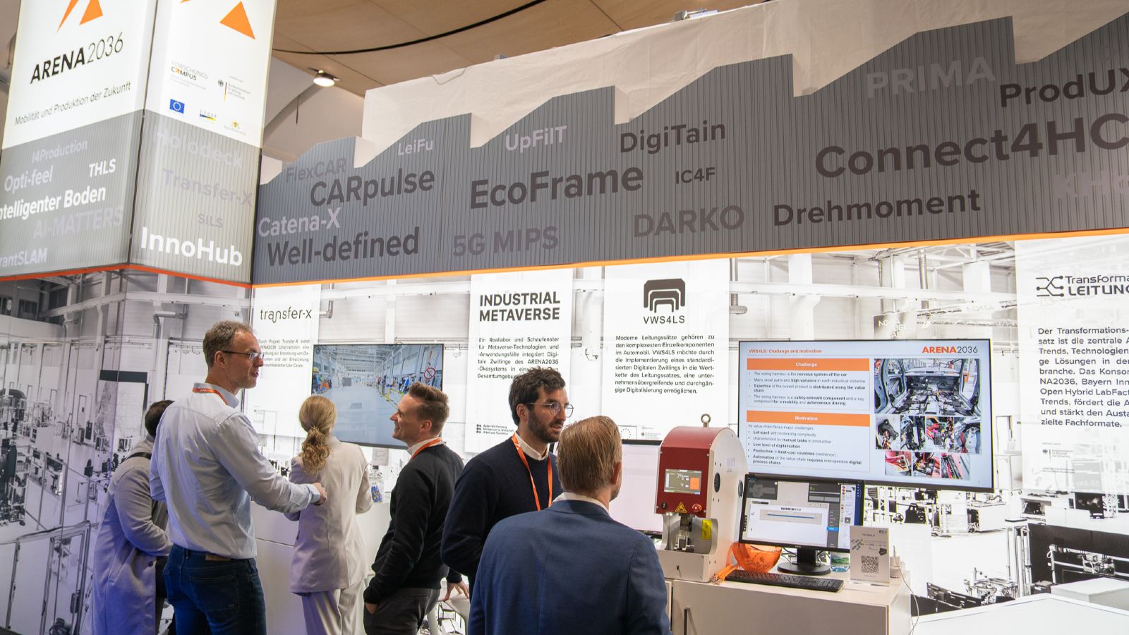 Bei der HMI präsentierte der Forschungscampus ARENA2036 die neuesten Entwicklungen in diesen Projekten und damit Impulse für die digitale Transformation und die Zukunft der industriellen Produktion. Ebenfalls am Stand vertreten war das Projekt Transformations-Hub für den Leitungssatz. Im Rahmen dieser Zusammenarbeit unter anderem mit dem Forschungscampus Open Hybrid LabFactory geht es darum, Innovationen in der Leitungssatzbranche, also in der Branche, die die Leitungen im Auto legt und somit den Kabelbaum erstellt, nicht nur zu diskutieren, sondern auch umsetzbar zu machen. Dieses Projekt erfasst die Bedarfe von Unternehmen und begleitet diese Schritt für Schritt bei der Umsetzung neuer Ideen.