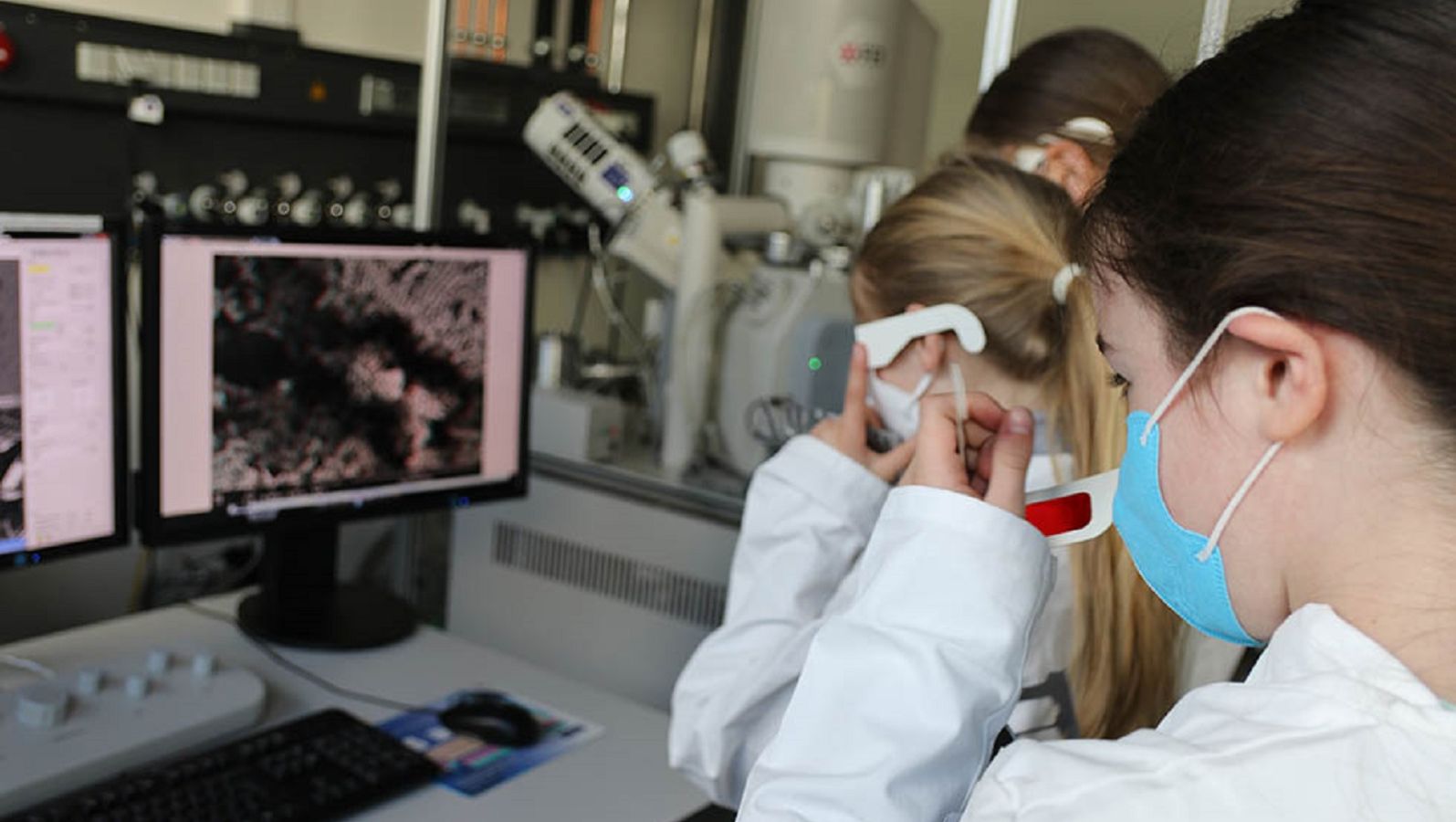 Nach viel technischer Arbeit folgte im Anschluss der Blick durch die Mikroskope. Dafür ging es in die an das Technikum angrenzenden Labore des Forschungscampus OHLF. Hier gab die Werkstoffprüferin, Frau Hamhe, den Mädchen die Gelegenheit kleinste Haarrisse und Kratzer auf den Oberflächen der Test-Namenschilder durch eine 400fache Vergrößerung zu erkennen. Weiter im Rasterelektronenmikroskop (REM) sahen die Mädchen Ihre Proben sogar in einer 3D-Darstellung auf dem Bildschirm.