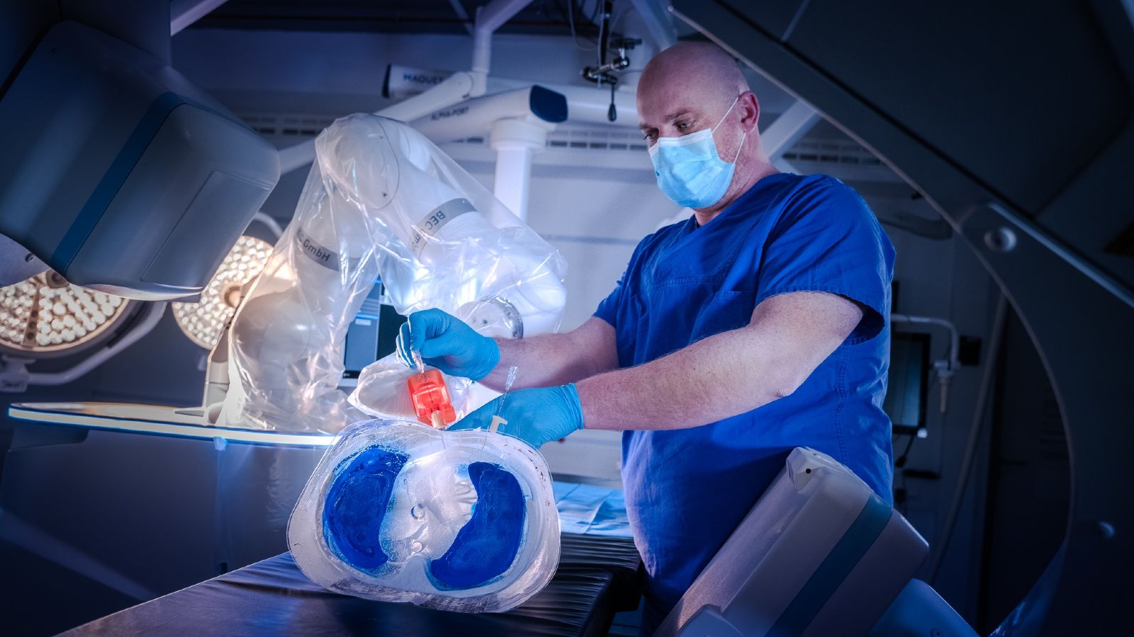 M²OLIE hat es sich zum Ziel gesetzt, den Patientenpfad von Krebspatienten mit Oligometastasen zu revolutionieren. Um den Paradigmenwechsel in der Tumortherapie aktiv und nachhaltig voranzutreiben, erforscht der Mannheimer Forschungscampus intelligente technische Lösungen an jeder Station des Patientenpfades – von der Aufnahme des Patienten bis zu dessen Entlassung. Ein kritischer Punkt in der Prozesskette mit viel Optimierungspotenzial ist die Biopsie, also die Punktierung von Organen wie der Leber. Sehr früh kam bei dem M²OLIE-Partner Fraunhofer-Institut für Produktionstechnik und Automatisierung (IPA) somit im Rahmen eines Projektes die Idee für ein Roboterassistenzsystem auf, um auch an dieser Stelle den klinischen Alltag zu erleichtern. Ein entsprechendes robotisches Assistenzsystem war damals nicht verfügbar. Daher soll ein Robotersystem etabliert werden, das anhand von bildgestützten Daten im Zusammenspiel mit einem Computertomographiesystem sehr präzise gesteuert werden kann, so dass die Ärztin oder der Arzt eine Nadel für die Biopsie ohne weitere Nachjustierung exakt platzieren kann. Damit verkürzt sich der gesamte Eingriff für Patientinnen und Patienten und die Strahlenbelastung sinkt.